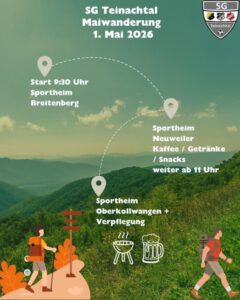 Eine gemeinsame Wanderung der SG Teinachtal findet am Freitag, 1. Mai 2026 statt. Abmarsch ist um 9:30 Uhr am Sportheim in Breitenberg. Gewandert wird zum Zwischenstopp beim Vereinsheim nach Neuweiler, wo noch „Nachzügler“ oder „Langschläfer“ dazu stoßen können. Von dort geht’s dann ab 11 Uhr weiter nach Oberkollwangen, wo beim Sportheim Gegrilltes zum Mittagessen vorbereitet ist. Selbstverständlich können sich am Wanderziel in Oberkollwangen auch noch Nichtwanderer zum gemütlichen Beisammensein einfinden. Um Essen und Getränke planen zu können, sind Anmeldungen erwünscht an Ralf Dürr (01706132052), Björn Gmeiner (015228476712) und Mark Lutz (015734718685). Die Abgabe von Essen und Getränken erfolgt auf Spendenbasis. Später geht’s dann auf direktem Weg wieder zurück zum Startpunkt nach Breitenberg. Die Vereinsführungen freut sich auf zahlreiche „Wanderlustige“.