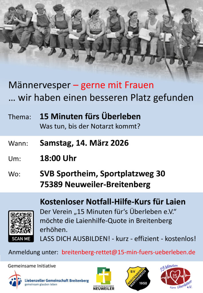 „15 Minuten für’s Überleben; Was tun, bis der Notarzt kommt“. Zu diesem Thema findet im Rahmen des „Männervespers“ im SVB-Sportheim in Breitenberg am Samstag, 14. März 2026 um 18 Uhr ein kostenloser Notfall-Hilfe-Kurs für Laien statt. Bei dieser gemeinsamen Initiative des SV Breitenberg/Martinsmoos, der Liebenzeller Gemeinschaft Breitenberg und der Evangelischen Kirchengemeinde Neuweiler möchte der Verein „15 Minuten für‘sÜberleben e.V.“, die Laienhilfe-Quote in Breitenberg und der gesamten Gemeinde Neuweiler erhöhen. Ziel dieses Vereins ist es, möglichst viele Menschen in Notfallhilfe und Frühreanimation auszubilden, um die Überlebenschancen der Patienten zu erhöhen.
